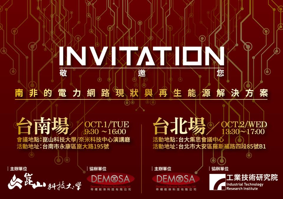 帝模 與 DIgSILENT 南非分公司,和 崑山科技大學 及 工業技術研究院 共同舉辦由電力系統模擬軟體 Power Factory 應用在「南非的電力網路現狀與再生能源解決方案」的學術研討會,分為台南場和台北場。