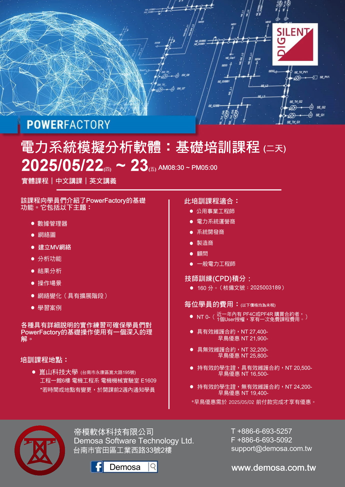 2025 年基礎培訓課程即將於 05 月 22 日至 05 月 23 日開課,親愛的用戶們或是對 DIgSILENT Power Factory 軟體有興趣的人員,請參考以下資訊或是課程型錄。