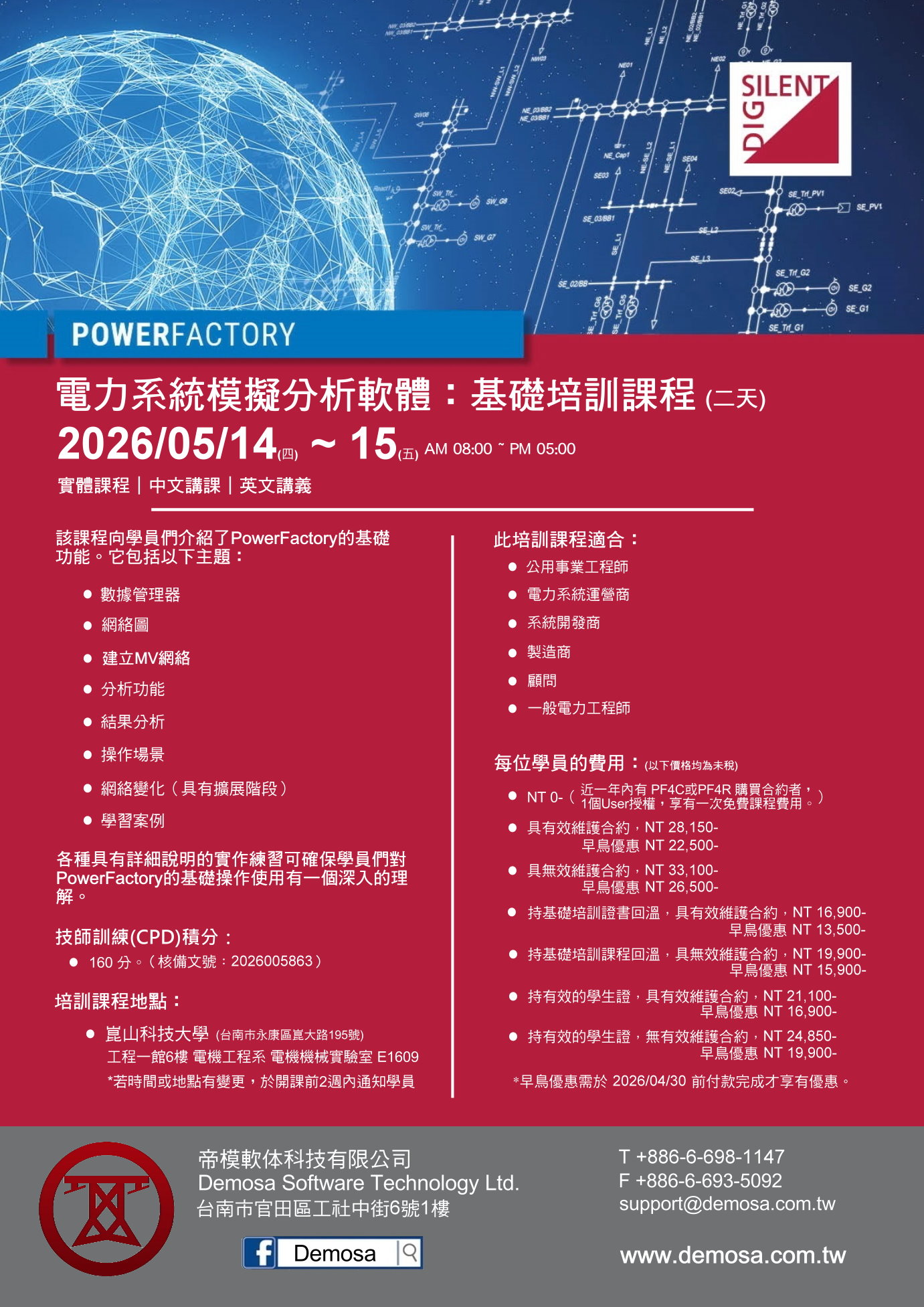 2025 年 基礎培訓課程 即將於 05 月 14 日至 15 月 15 日開課,親愛的用戶們或是對 DIgSILENT Power Factory 軟體有興趣的人員,請參考以下資訊或是課程型錄。