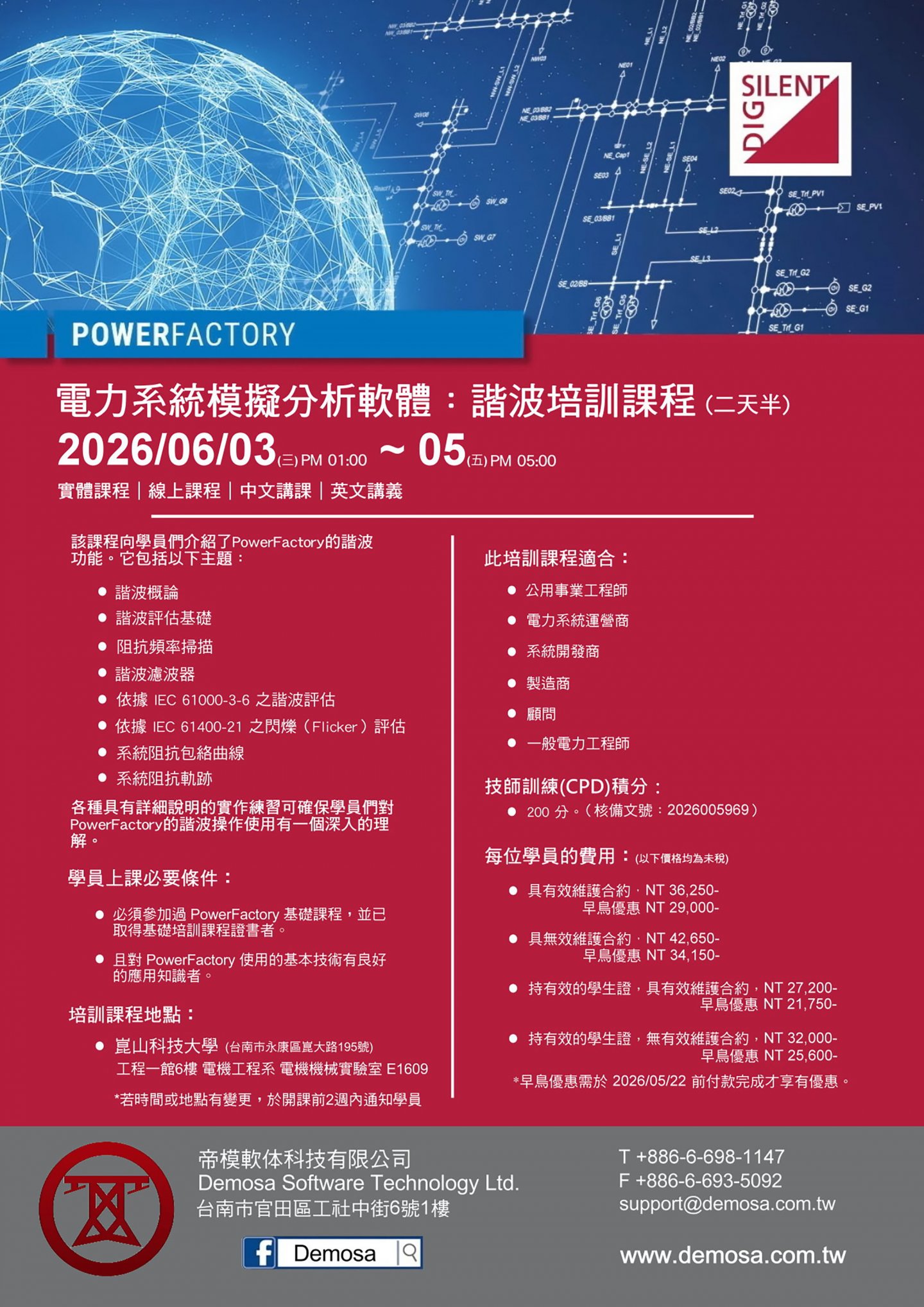2026 年 諧波培訓課程 即將於 06 月 03 日至 06 月 05 日開課,親愛的用戶們或是對 DIgSILENT Power Factory 軟體有興趣的人員,請參考以下資訊或是課程型錄。