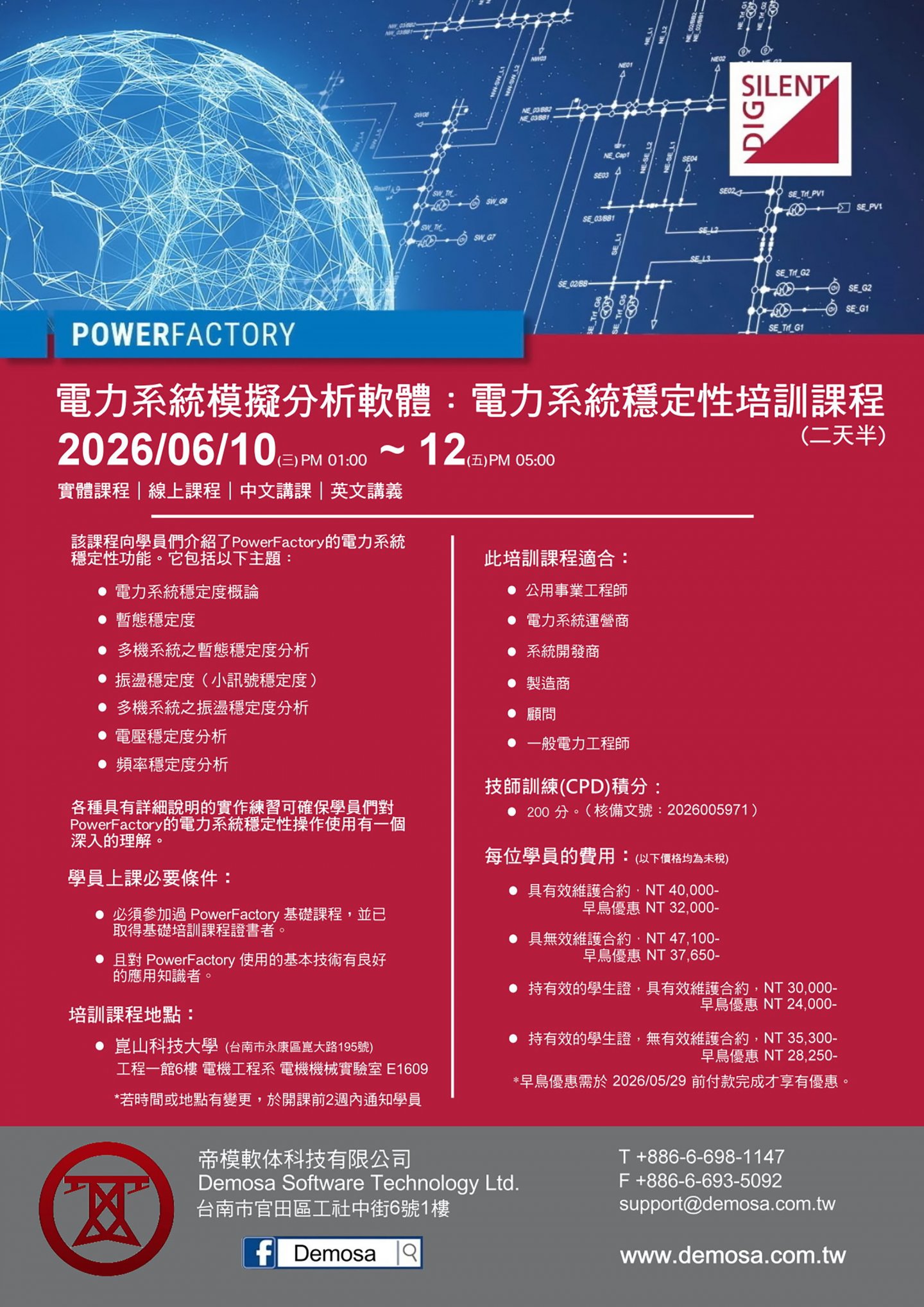2026 年 電力系統穩定性培訓課程 即將於 06 月 10 日至 06 月 12 日開課,親愛的用戶們或是對 DIgSILENT Power Factory 軟體有興趣的人員,請參考以下資訊或是課程型錄。